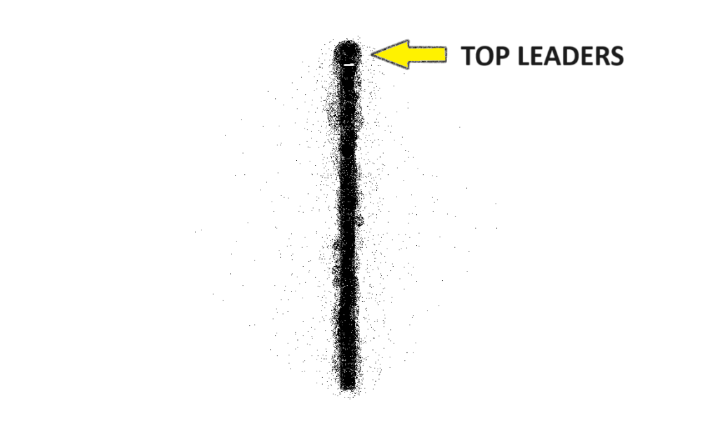 Take a look at the image. “Social identity” is represented by an axis, and individuals by the black dots. At the top are the highest leaders where the concentration is densest. As you can see, the further away from the axis, the population density becomes sparser; the spaced-out dots are individuals with a significant level of divergence. Through this picture, it’s easy to see why different individuals will have a hard time in finding a common ground with the majority.